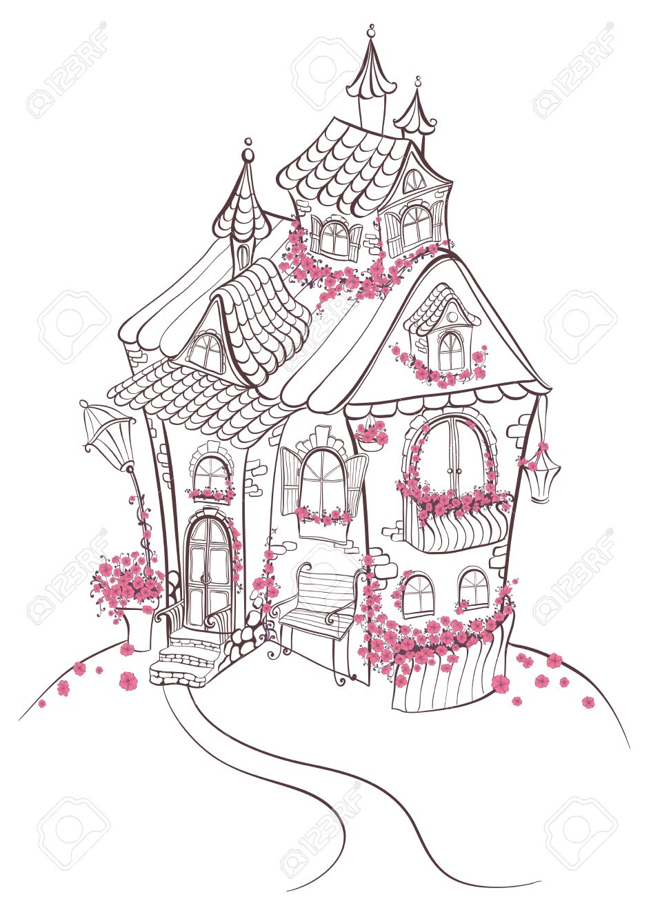 ファンタジー漫画のおとぎ話の家素晴らしい建築物と赤い花 手描きの背景イラスト のイラスト素材 ベクタ Image